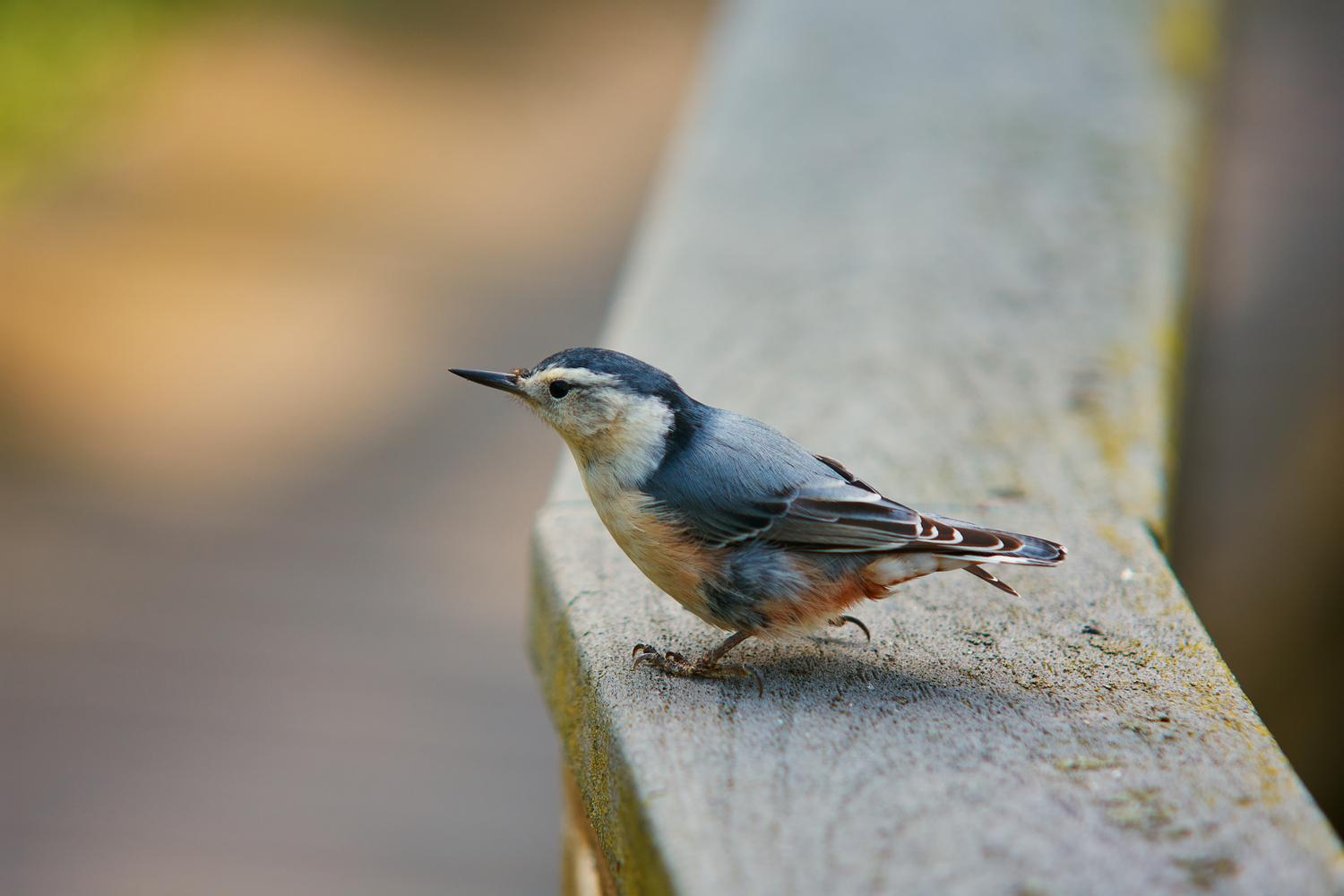 A white-breasted nuthatch bird on a rail.