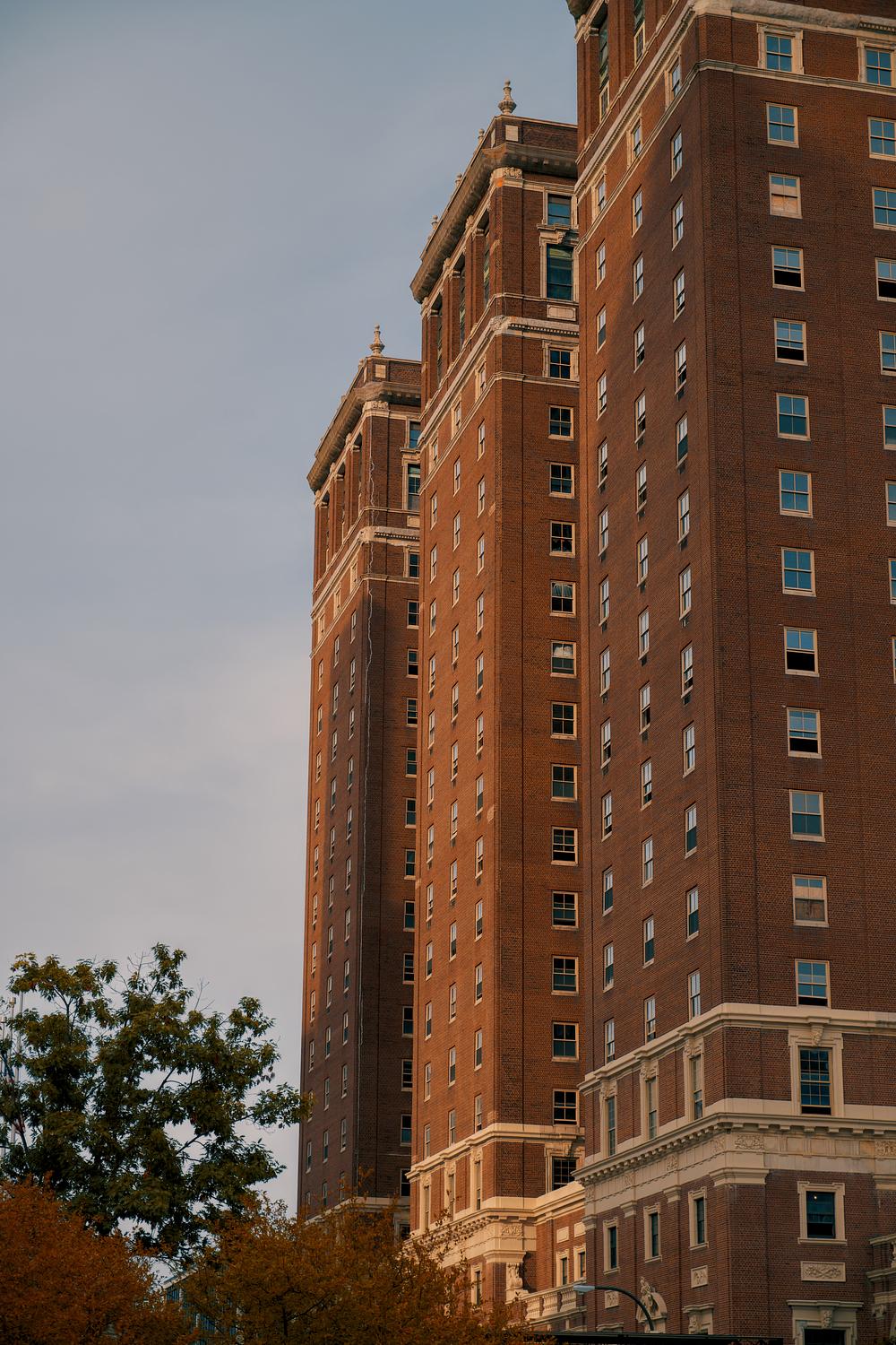 Three buildings with sunset shining on them.